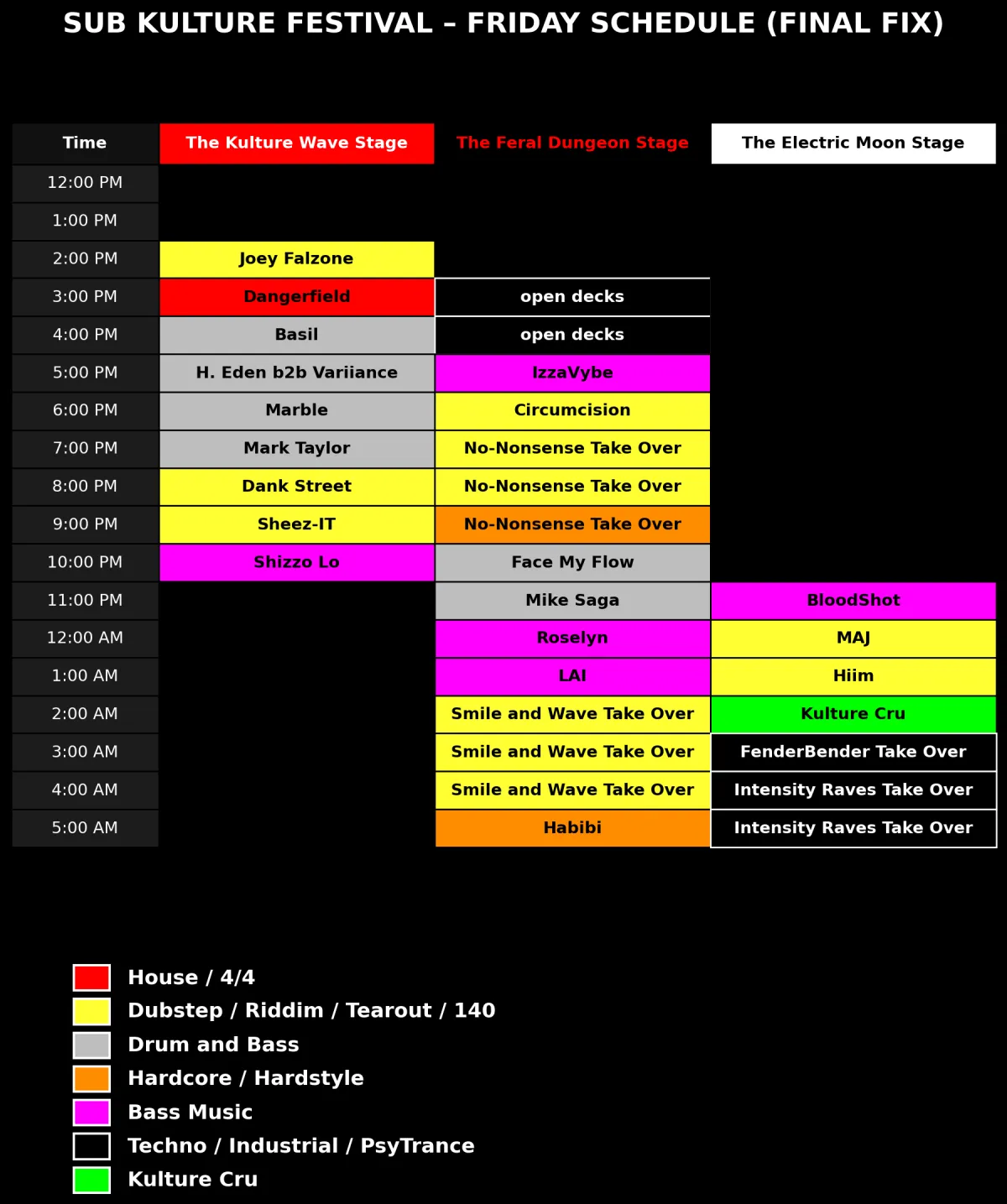 Genre Diversity: The lineup often spans across drum and bass, riddim, dubstep, bass house, techno, trap, gabber, Happy Hardcore, Hardstyle, UpTempo, hyperpop, chillout, and experimental bass, catering to adventurous music lovers.